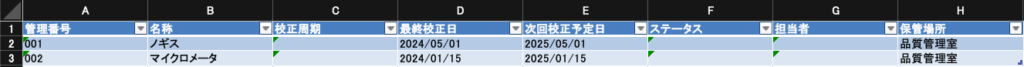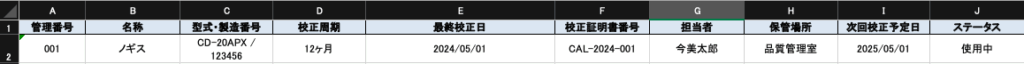 | 次回校正予定日 | 2025/05/01 | 自動計算可能(最終校正日+周期) |